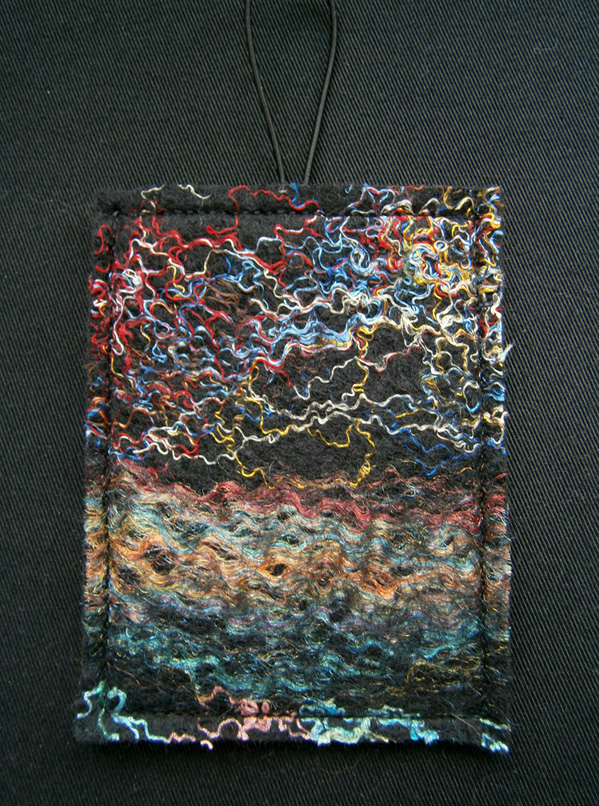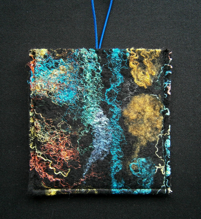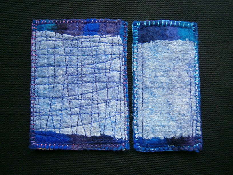 One piece of felt that I found when I was searching through, was a sample I’d made using silk throwster’s waste, rainbow trilobal nylon and nylon fibre that I’d dyed. It wasn’t a pretty piece, but then it was only a sample 🙂 The first piece I started to make out of it is a pouch just the right size for holding a pack of cards, small notepad and a pencil-perfect for train journeys with young kids. There’s silk throwster’s waste on the left and dyed nylon on the right.