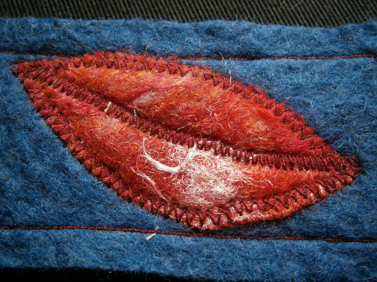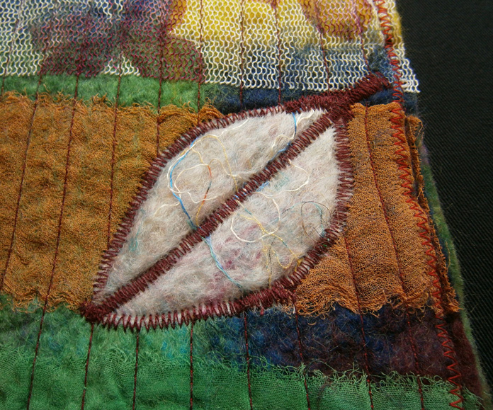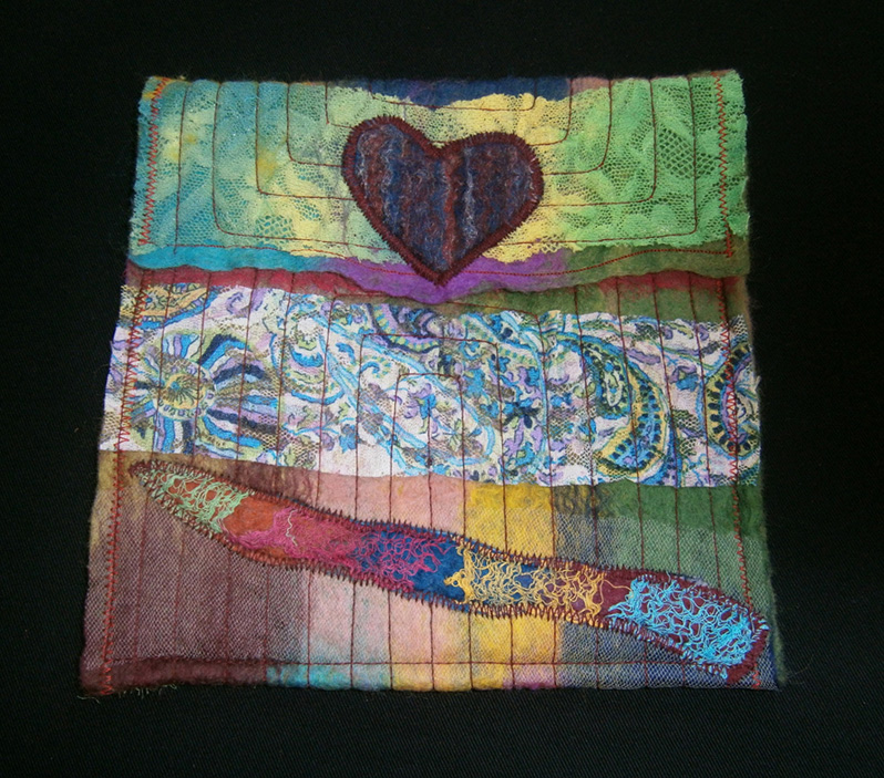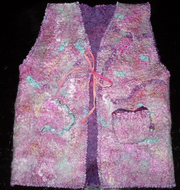 After embellishing, I could NOT help but put some beads on but each and everyone of them has been sewn on at least 3 -4 times, didn’t want her pulling them off and needed them to be really secure . Its just finished off with a blanket stitch all round and a ribbon tie closure . I added a little pocket on the front because I loved that piece of off-cut , Very Hippy like dont you think lol I am happy with it but I do think I used to much wool over the silk and muslin, and actually I wasn’t sure if it was muslin or gauze but it was very fine and did work well