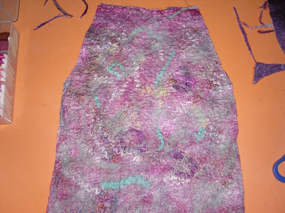 Then I flipped it and added lots of silk, sari silk, silk threads and added extra bits of fiber over that, maybe to much though, this is after wetting , rubbing and rolling