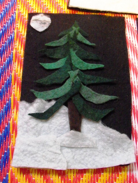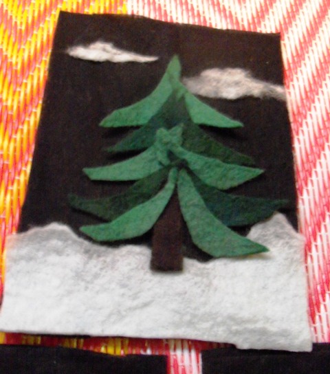 I was tidying up after making something else and had a pile of green trimming. With Zed’s felt scraps post still fresh in my mind they looked like branches to me. I think I must be in a tree mood. I used prefelt for the back ground because I didn’t have any scrap black felt and I wanted to get on with making the pictures and not with felt making.