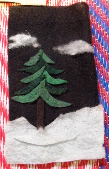 I used the edge of an off cut in very pale blue piece of felt for the snow and a very thin edge piece for the clouds and moon. its hard to see but I layered the snow pieces on  2 of the pictures to see if it would give more depth after felting. i have never had much luck wet felting finished felt to semi felted pieces but after some rubbing and rolling it all went together really well. I am quit pleased with how they turned out.