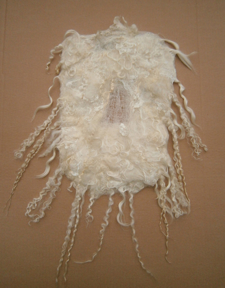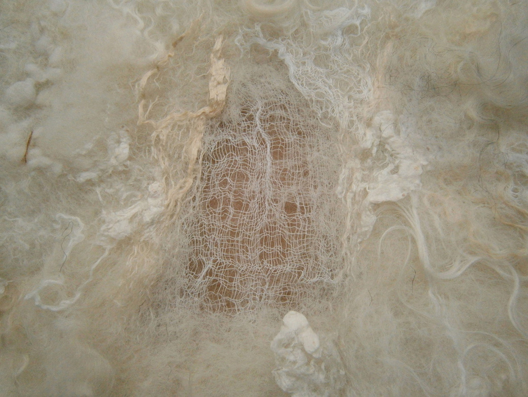 I kept the whole texture piece soft and spongey by using wools like English 56s, Swaledale, Texel and Cheviot. For surface texture I used cotton gauze, scoured Bluefaced Leicester and Wensleydale as seen in this photo.