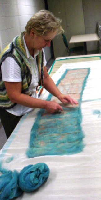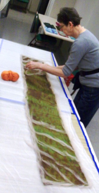 Then Paula and I spent the rest of the day making samples for the class. We’re starting with a flat piece of felt with embellishments. This one is mine with a silk hankie, hemp, pre-yarn and pelsul locks.