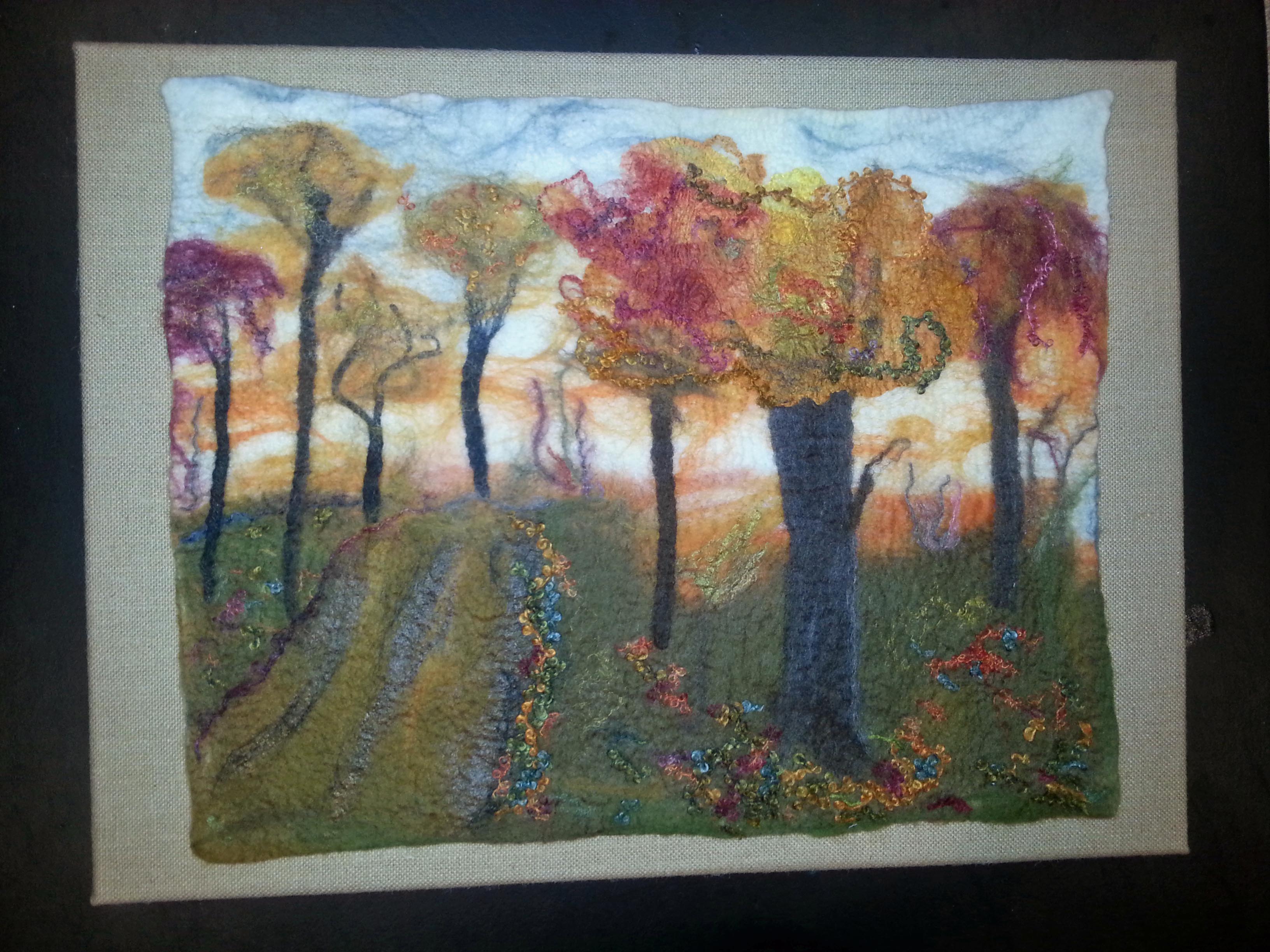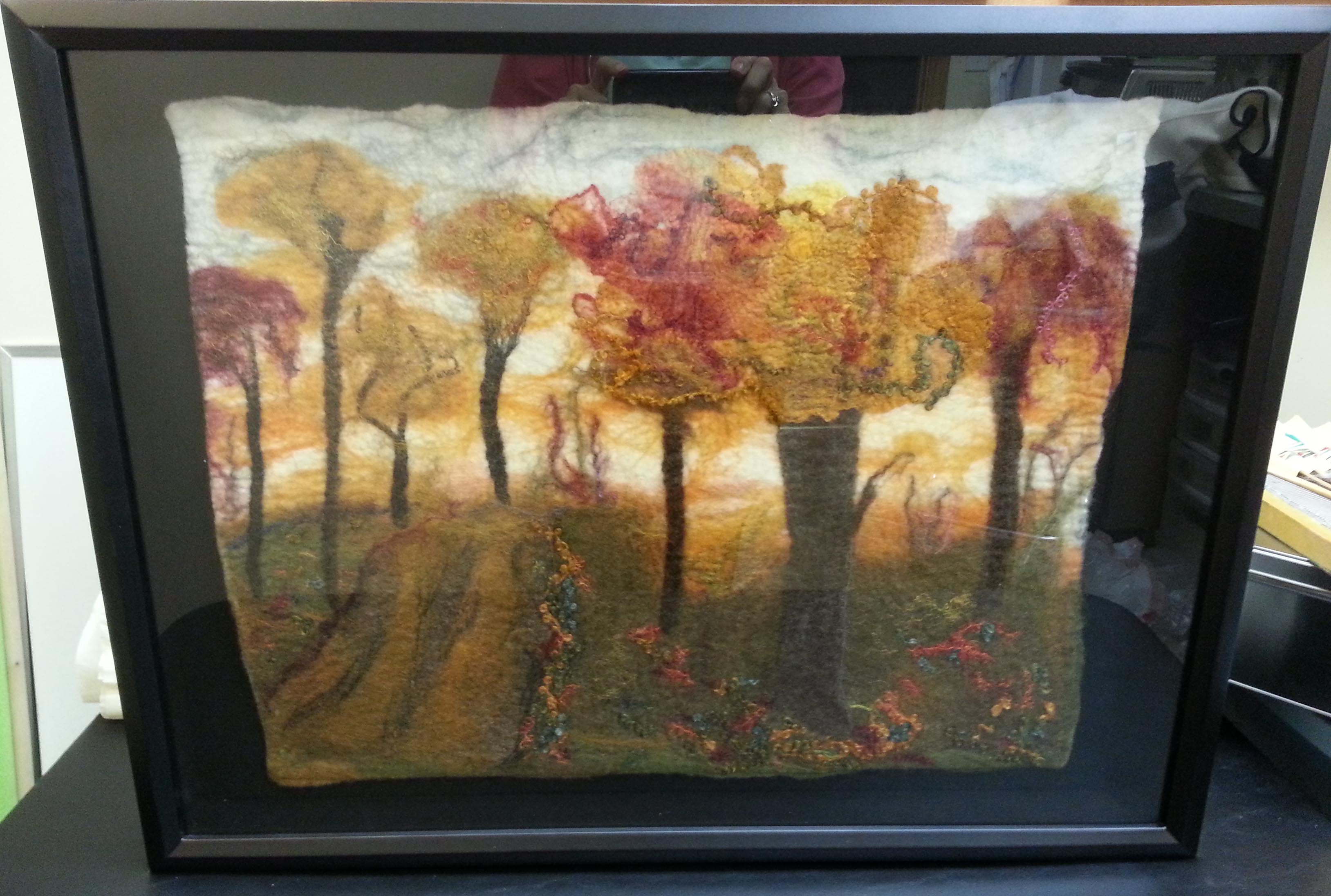I haven’t mounted it yet since after jiggling it around and trying to stretch out a little I have to make a few repairs. I’m amazed at how my felting has improved this past year. I can even make straight edges if I want. If I decide to start selling or gifting my artwork, I may have them professionally mounted and framed.
