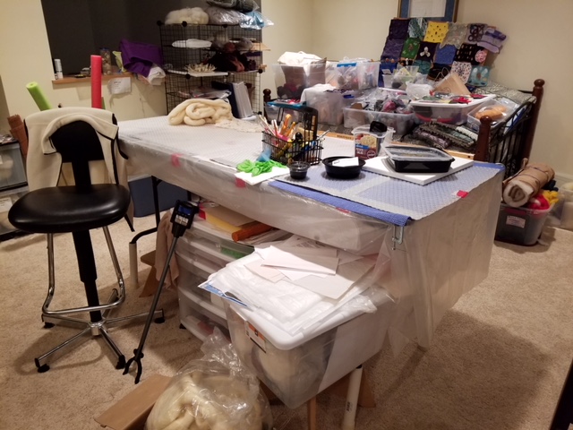Well I’m not alone! My bins of roving are organized by color but that’s about it. I didn’t include pics of my sewing spaces either, just as chaotic I’m afraid. It was wonderful see everyone’s work spaces messy or clean. We know we’re all fiber addicts and creators, but it added a more personal dimension seeing those creative spaces. Thanks for sharing!