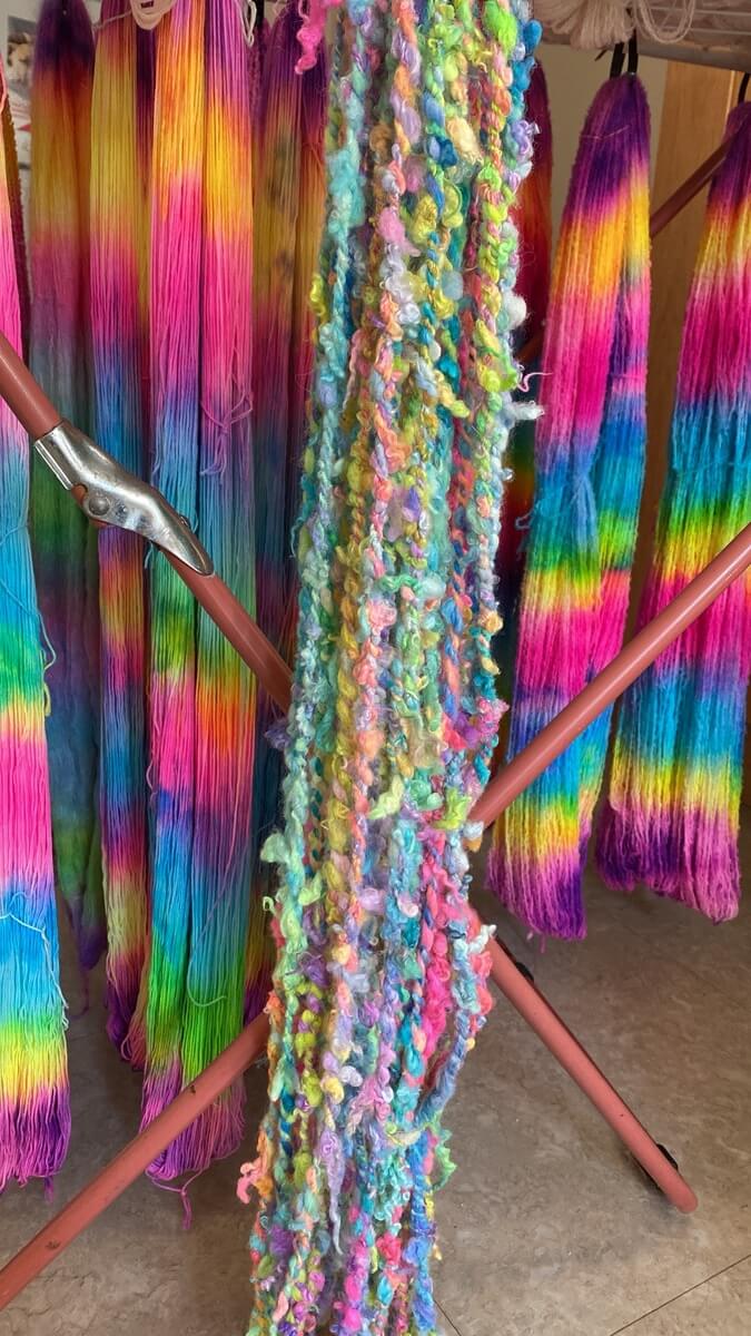 hand-dyed-yarns-drying-eleanor-shadow Published September 17, 2025 at 675 × 1200 in I did two yarn festivals in a month ← Previous / Next → Rainbow hand dyeing and hand spinning drying.