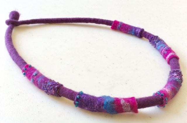 This choker style necklace is wet felted Superfine Merino. It came about because I’d got some small offcuts of a very thin felt left over from a collar. Rather than throw them out (perish the thought!) I had the idea of sewing each one down the long edge, to form tubes, and then use them as “beads”, threading them onto a felted cord. To keep everything in place and avoid them slipping on the cord I attached small beads, sewing right through front to back.