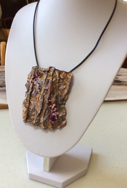 The rectangular pendant was made from heat distressed Tyvek which I’d first painted with metallic acrylics. I’ve embellished it with pink, purple and mustard colonial knots and a few bronze seed beads and strung it onto a rubber cord.