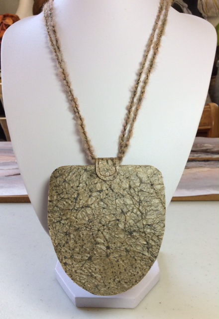 This larger pendant is my favourite. I’ve kept it very simple using a dark grey cotton velvet furnishing fabric on a pelmet vilene background. I’ve sewn on brown craft paper, scrunched and painted with black acrylic to give it a leathery look, and added a metal trim, wooden bead and two smaller metal beads. The back is also covered in the leathery craft paper. Again the cords are simply wrapped knitting yarn but these are much longer than they look in the photo so the pendant hangs below the bust line.