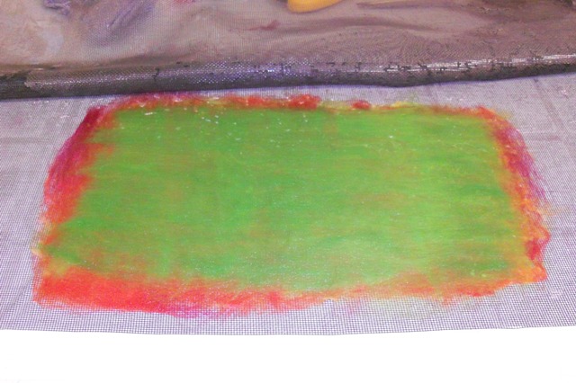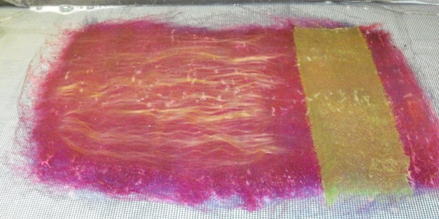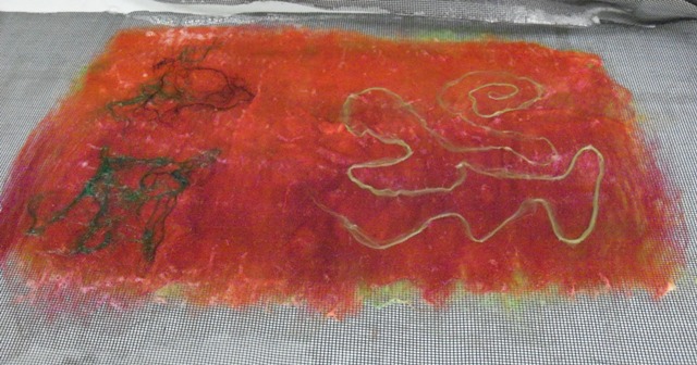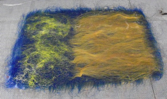 So, I got on my white horse and started felting on my resist straight away with a lot of good will. I assumed that the coarser wool would need less layers to obtain the same felt (do not ask, pre-christmas chaos guinea pigs mind fugue hobblegobble chicachicacha) and I decided on 4 good layers.