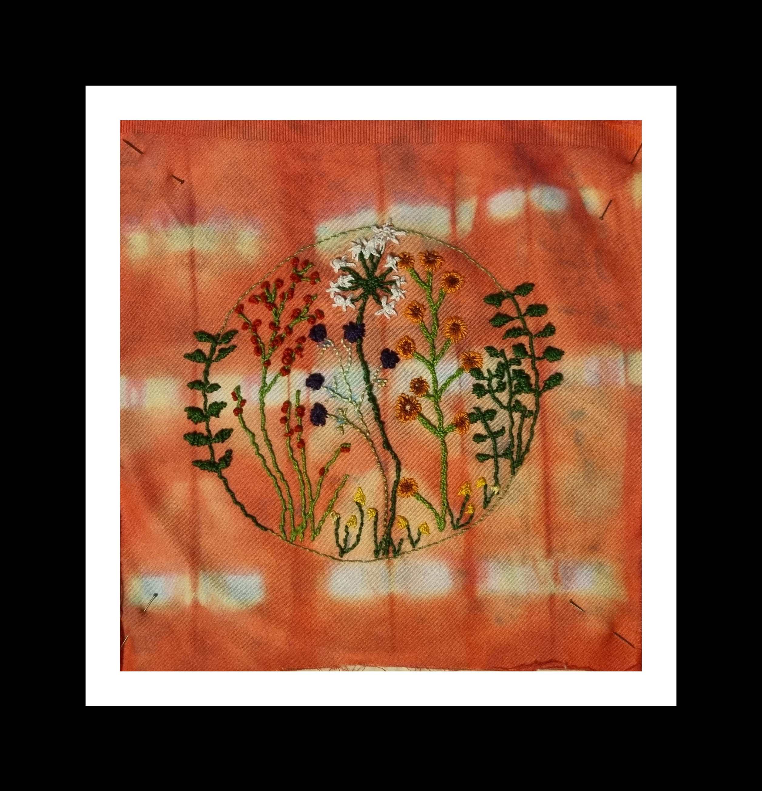 embroidered piece Published February 10, 2025 at 2512 × 2606 in embroidered piece ← Previous / Next → Using the dyed fabric samples, I tried my hand at embroidery over Christmas