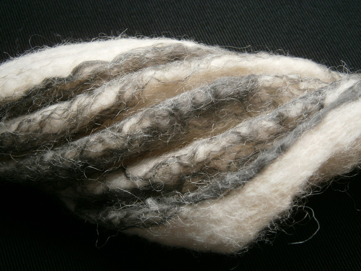 Humbug Jacob tops are a stripey blend of black and white Jacob wool tops. Just on its own it produces a nice result, but I thought I’d try using strips of black and white bamboo tops for effect. Both bamboos are really soft, white bamboo looks silky, but black bamboo is fluffy and more like fluffy cat fur. They felt quite differently too, the white keeps its silkiness and shines really nicely, and the black almost fades into the background, staying very matt.