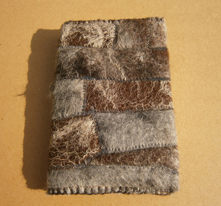 This first notebook cover that I finished this week took ages to make. My temperamental sewing machine keeps refusing to catch the bobbin thread with the needle. Occasionally I can force it to, then it runs for a while, then I go to turn the piece I’m working on and realise it was just making sewing noises and everything I thought I’d just sewn is loose 🙁 I kept going back to this until it was finished, then put the machine away so it can’t annoy me anymore. I had a collection of felt pieces I’d made with natural coloured wools and plant fibres. None of them were big enough for notebook covers and either too thick or too thin for coin purses, so I thought I’d make a few natural coloured collage notebook covers. Or just one as it turned out. I used some unbleached calico as the backing fabric to sew the pieces onto. I really like the way this turned out. This is the front: