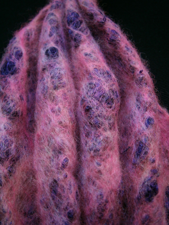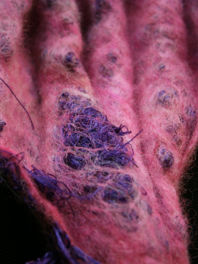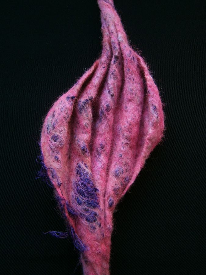 I wet felted the tentacles, smoothing them out as much as possible. While the tentacles were still wet I curled up 3 of them and fixed them with light wire to help them “remember” the curves when they had dried – at which point I lost the curled up ones. (I blame The Borrowers.) As a result I had to make three more tentacles and, since they were to be curled anyway and I needed them quickly, I just made wet felted cords which were curled up.