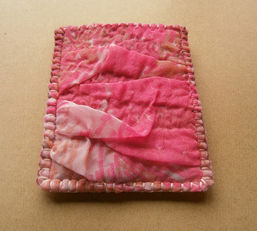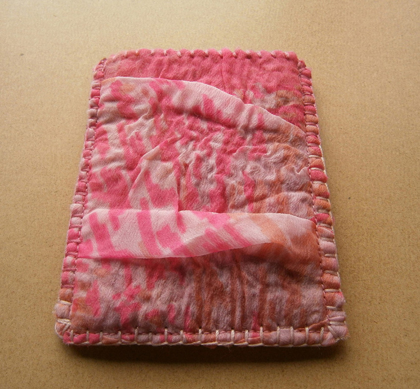 This was one of the purses I hadn’t even blanket stitched, it’s made from the same piece of felt as one I made earlier. It’s a slubbed wool which I added some cotton and silk threads to and some strips of rolled edges from silk scarves. Front: